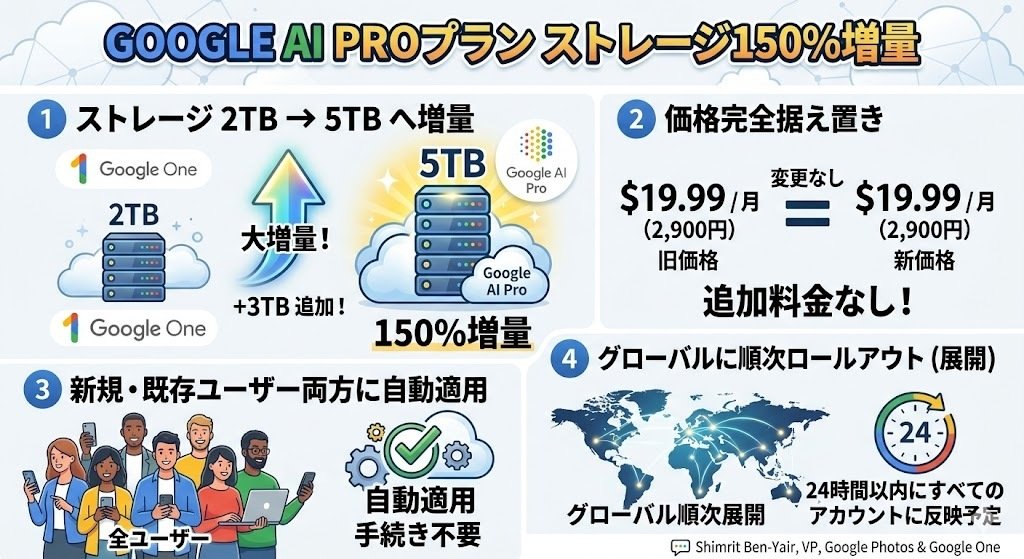 今回の変更は非常にシンプルです。Google AI Proプランに含まれるクラウドストレージの容量が、2TB(テラバイト)から5TBに増量されました。