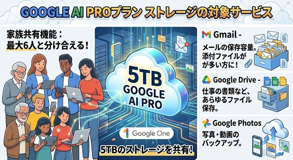 Google AI Proプランの家族共有機能を使えば、5TBのストレージを最大6人の家族メンバーで分け合うことができます。