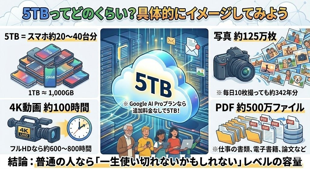 まず前提として、1TB(テラバイト)は約1,000GB(ギガバイト)です。スマートフォンのストレージが128GBや256GBであることを考えると、5TBはスマートフォン約20〜40台分の容量に相当します。