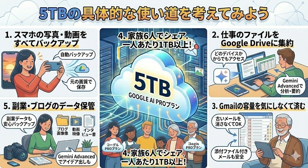 もちろん、プロのカメラマンや動画クリエイターのように大量の高画質データを扱う方は別ですが、日常的にスマホで写真を撮り、仕事の書類をクラウドに保存し、メールをやり取りする程度であれば、5TBを使い切ることはまず考えにくいでしょう。