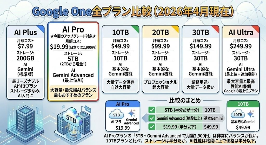 ここで、Google Oneの全プランを比較してみましょう。今回アップグレードされたAI Proプランがどの位置にあるのか、全体像を把握することで、自分に最適なプランを選びやすくなります。