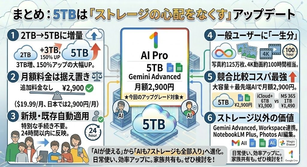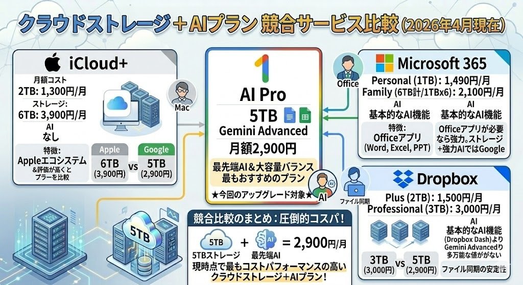 この記事では、今回のアップグレードの詳細から、5TBの具体的な使い道、競合サービスとの比較、そして「自分は契約すべきなのか?」という判断材料まで、初心者の方にもわかりやすく徹底解説していきます。