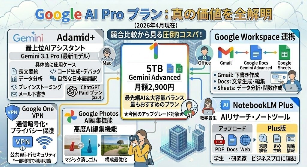 こうして比較すると、AI Proプランの「5TB + Gemini Advanced で月額2,900円」というのは、非常にバランスが良いことがわかります。10TBプラン(月額$49.99)と比べると、ストレージは半分ですが、AIの性能は格段に上です。しかも価格は半分以下です。