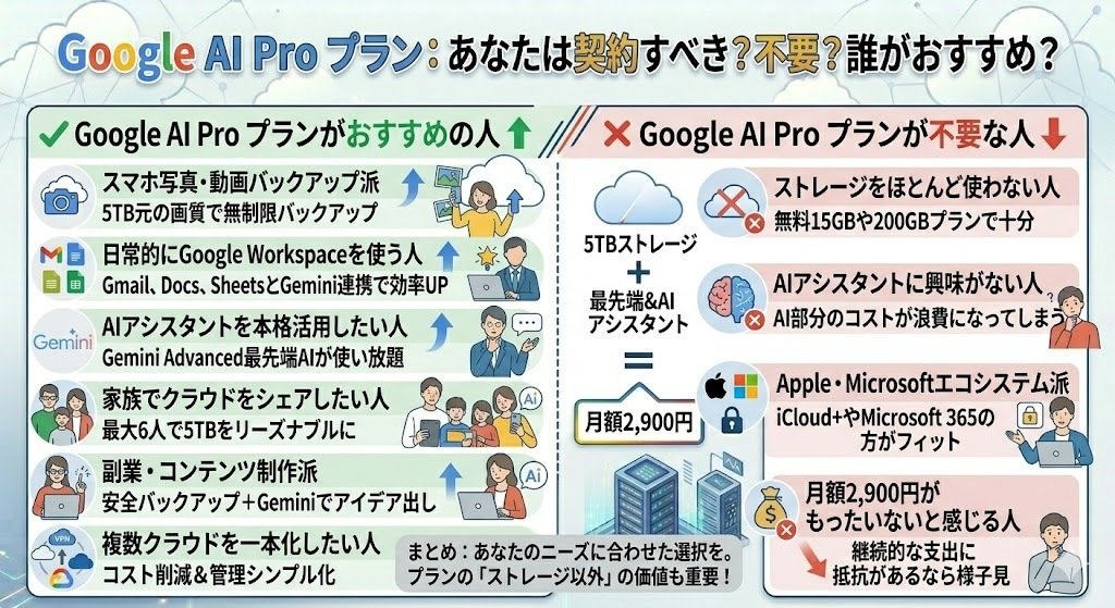 「ストレージもAIもバランスよく使いたい」という方には、AI Proプランが最もコストパフォーマンスの高い選択肢と言えるでしょう。