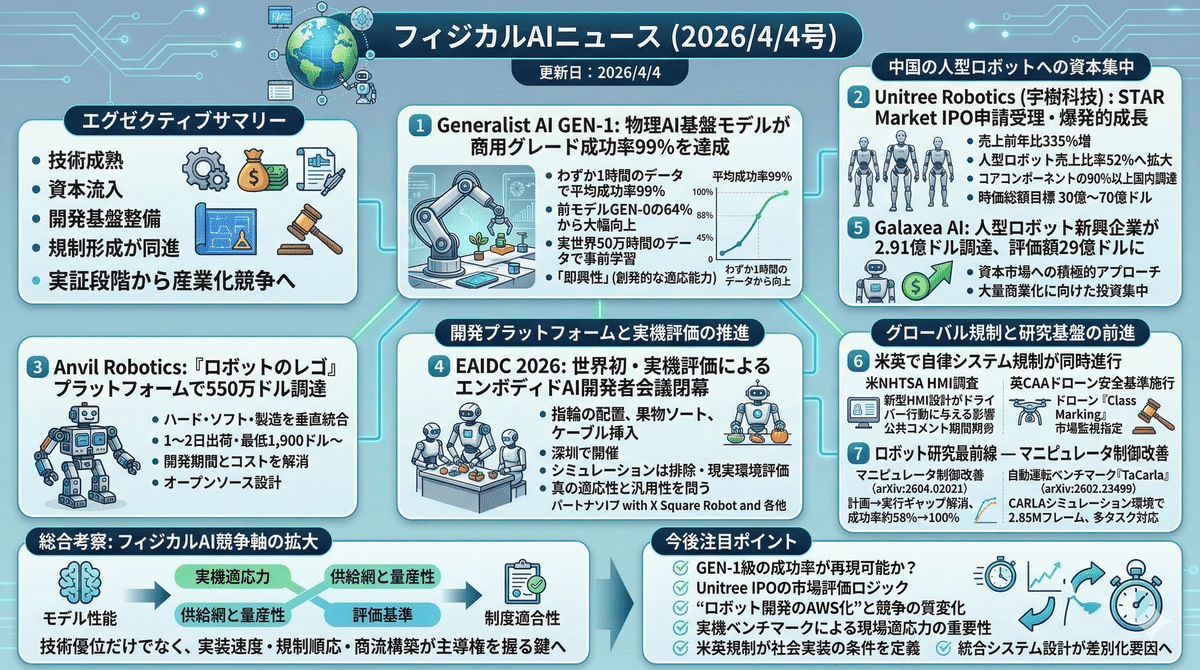 2026/4/3のフィジカルAIニュースは、技術成熟・資本流入・開発基盤整備・規制形成が同時多発的に進んでいることが見えた。Generalist AIのGEN-1は、わずか1時間のロボットデータで平均成功率99%を達成し、物理AI基盤モデルが商用運用に近い信頼性へ到達した可能性を示唆。中国ではUnitree RoboticsのSTAR Market IPO申請受理とGalaxea AIの大型調達が続き、人型ロボット分野への資本集中が鮮明になった。Anvil Roboticsはロボット開発の短納期・低コスト化を推進し、EAIDC 2026はシミュレーション依存を脱した実機評価の重要性を提起。さらに米英では自律システム規制が進み、研究面でも制御手法とベンチマーク整備が前進しており、物理AIは実証段階から産業化競争へ入った。