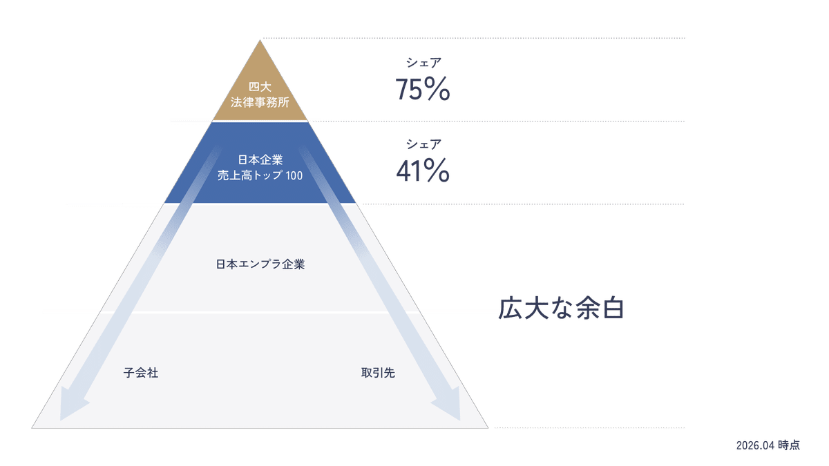 この地盤は、LegalTech黎明期(コロナ前)から超エンプラにコミットした狂気、そして、日本を代表する「四大法律事務所」の支援によってなし得た再現性のない道程です。