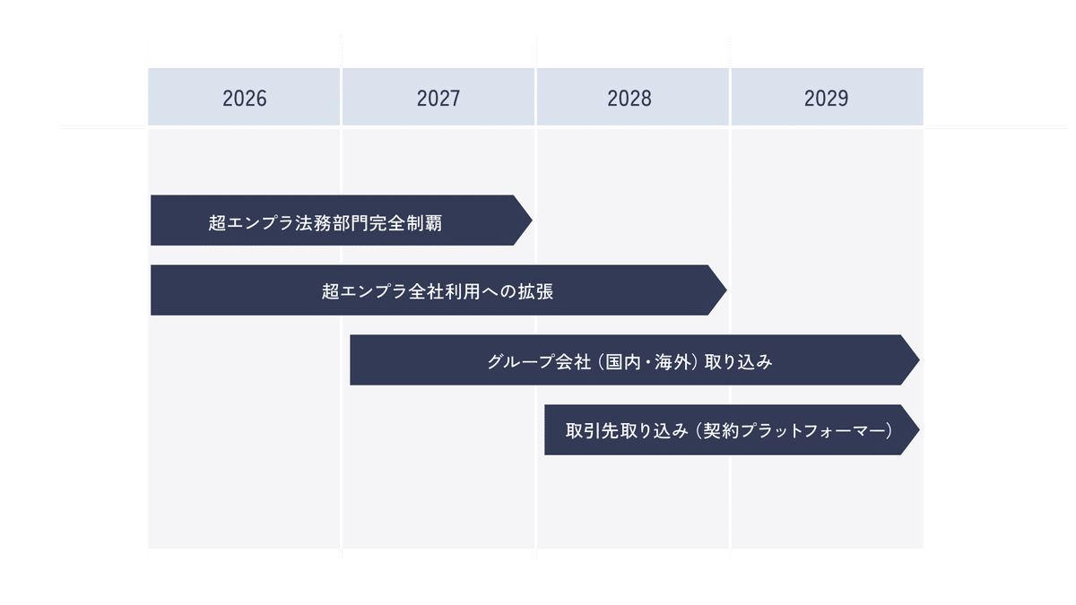 時間軸としては、今後3-4年で実現したいと思っています。5億件すべての契約をMNTSQで交渉いただくには時間がかかるかもしれませんが、日本の主要企業の契約まではこの時間軸で押さえたいと思います。