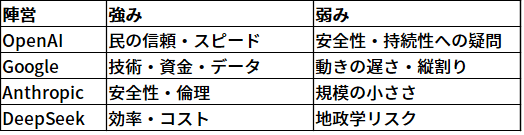 勝負を決するは、技術の巧拙のみならず、人の信頼と規制への対応の妙、そして資金と人材の確保——この三者を兼ね備えた者が、次の天下人となりましょうぞ。