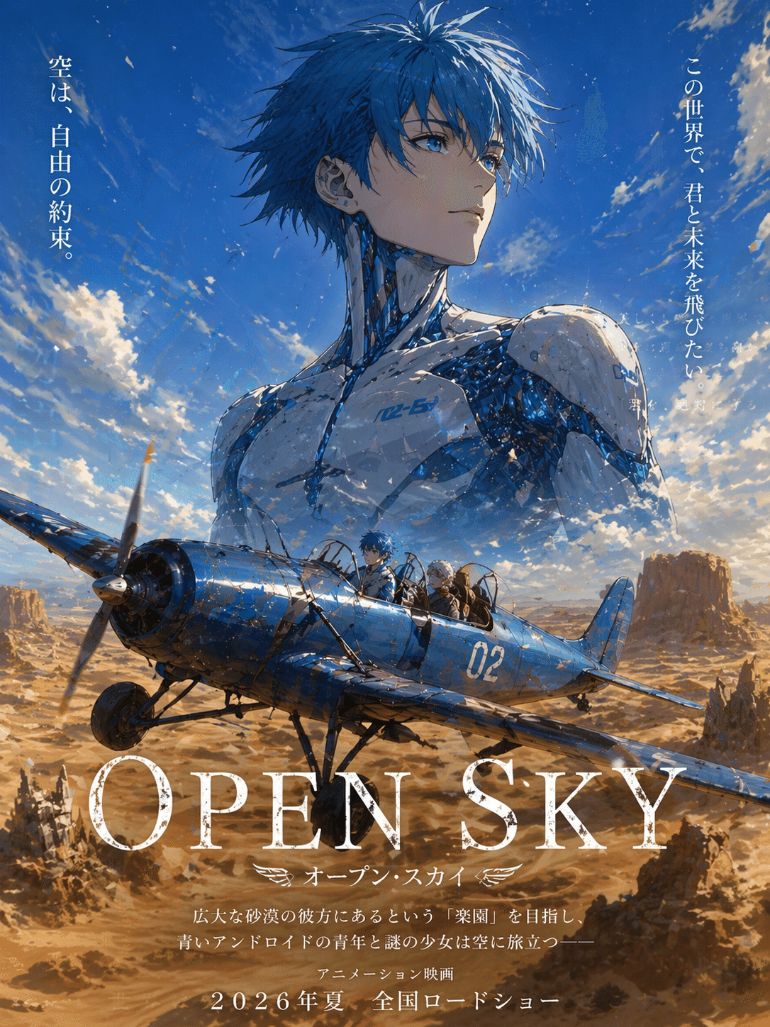 「青いアンドロイドと、青い髪の18歳青年。青い二人乗りプロペラ機と砂漠の世界。アニメ映画のポスターをGPTimage2で作成して。映画の題名はOPEN SKY」