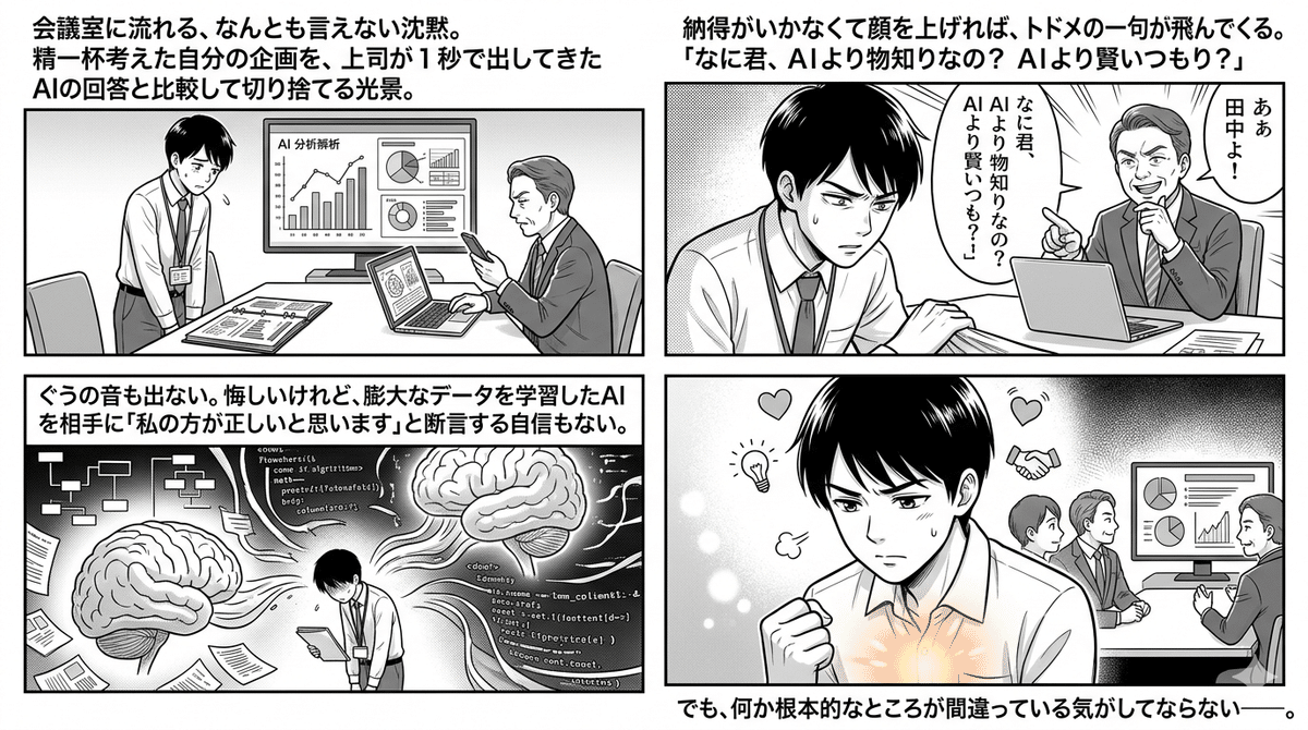 会議室に流れる、なんとも言えない沈黙。精一杯考えた自分の企画を、上司が1秒で出してきたAIの回答と比較して切り捨てる光景。