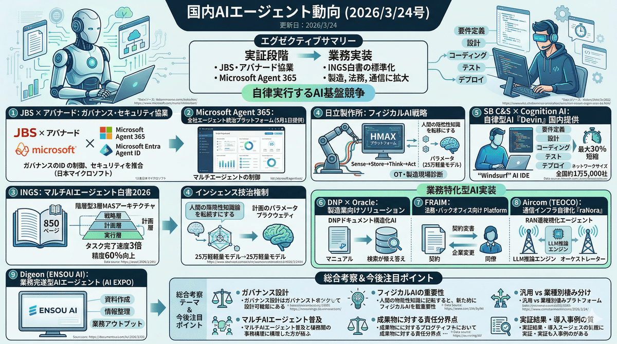2026/3/23は、AIエージェントが単体機能の高度化ではなく、「統治」「現場接続」「業務完遂」の3軸で進化していることが見えてきている。Microsoft系では全社統制やID管理が整い、エージェント運用の企業標準化が進む。一方で、日立やDNPはOTや現場文書と結びつけ、抽象的なAI活用を実業務へ落とし込んでいる。さらにFRAIM、Devin、raNora、ENSOU AIは、法務、開発、通信、社内業務における自律遂行を前面に出し、AIを補助ツールではなく実務主体へ近づけている。今後の競争軸はモデル性能そのものより、既存業務への接続力、統制可能性、導入後のROI可視化に移る公算が大きい。