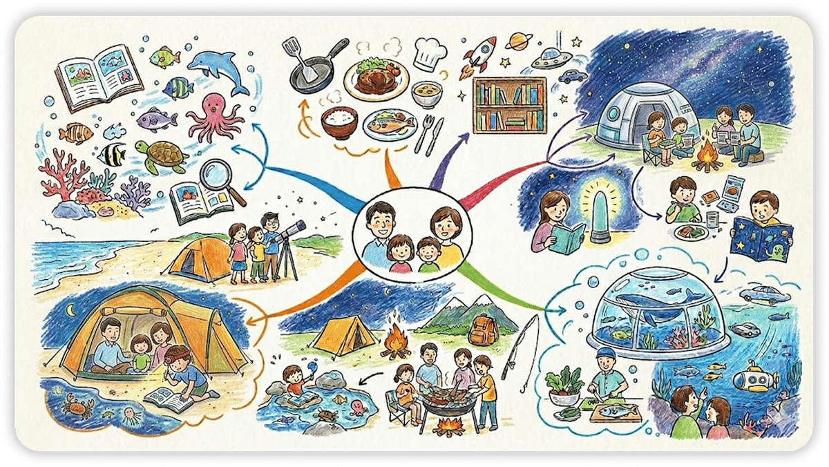 家族 4 人の「好き」が重なる体験アイデアをマインドマップにして。文字無し、手書きイラストで。