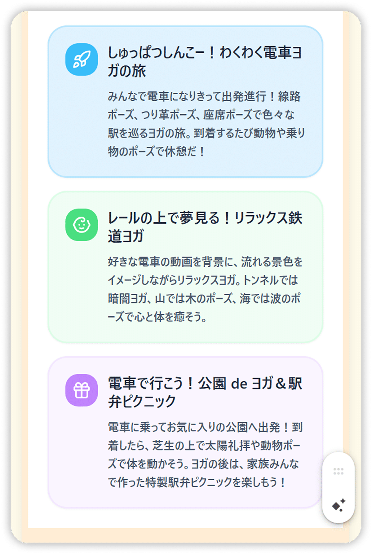 4. 「アイデアを出す」ボタンを押すと、 その組み合わせで楽しめる週末の体験を 3 つ提案