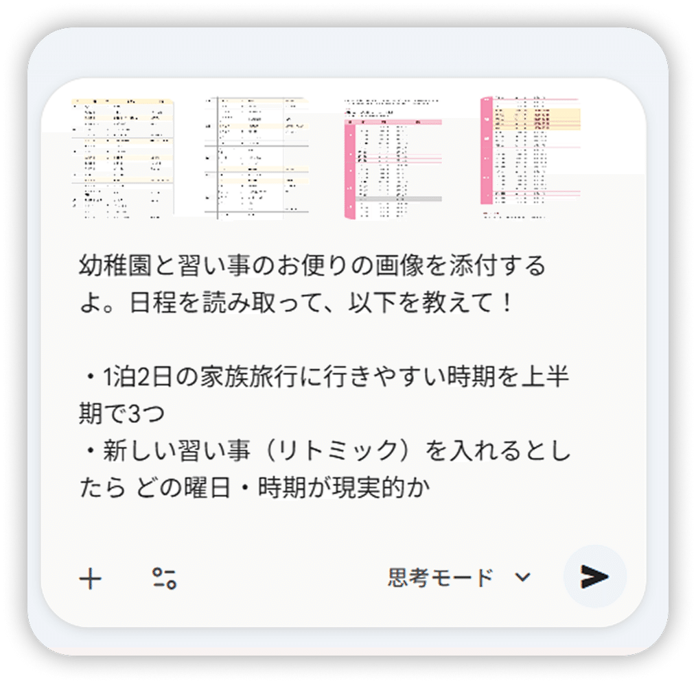 学校行事・習い事・仕事の繁忙期......。複雑に絡み合うスケジュールを Gemini と一緒に整理してみましょう。「旅行できる週末はどこ?」「新しい習い事を入れる余白は?」と話しかけながら、自分では見えていなかった「意外なすき間」を一緒に見つけていきます。