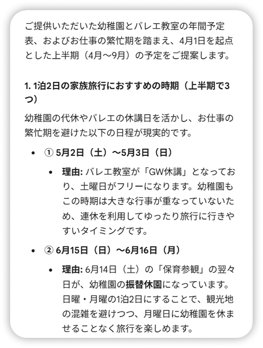 ・1 泊 2 日の家族旅行に行きやすい時期を上半期で 3 つ