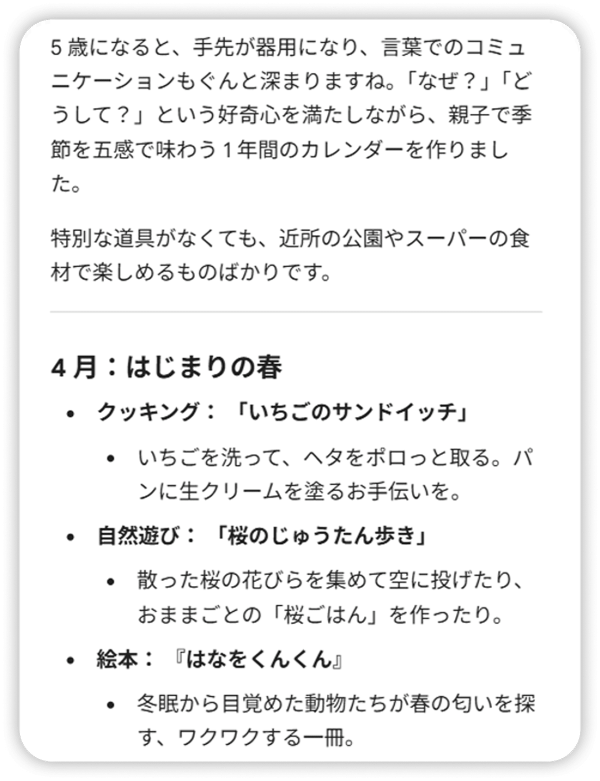 5 歳の子どもと楽しめる「季節の小さな体験」を月ごとに提案して。4 月〜 3 月の 1 年分で、各月ごとに以下の 3 つをお願い!