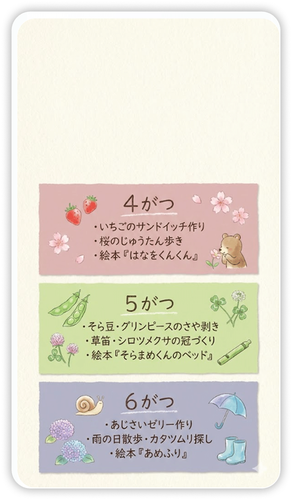 ・各カードには月名と、その月の体験を 2〜3 個短い言葉で書いて(例:「たけのこ掘り」「桜の押し花」「てんとう虫さがし」)