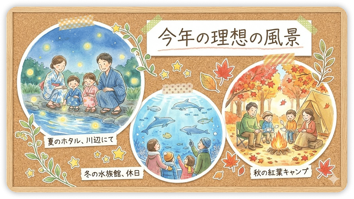 家族の「今年の理想の風景」を 1 枚の ビジョンボードとして画像にして。 ・夏の夜、海辺でホタルを見る親子 ・秋の紅葉の中でのキャンプ ・冬の休日、自宅でみんなで料理している場面 温かく、やさしいタッチのイラストで。