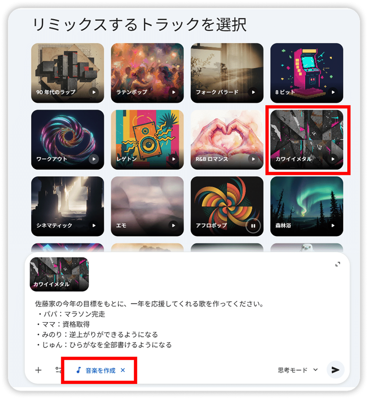 例えば、リミックするトラックに「カワイイメタル」を選んで、次のように伝えてみましょう。