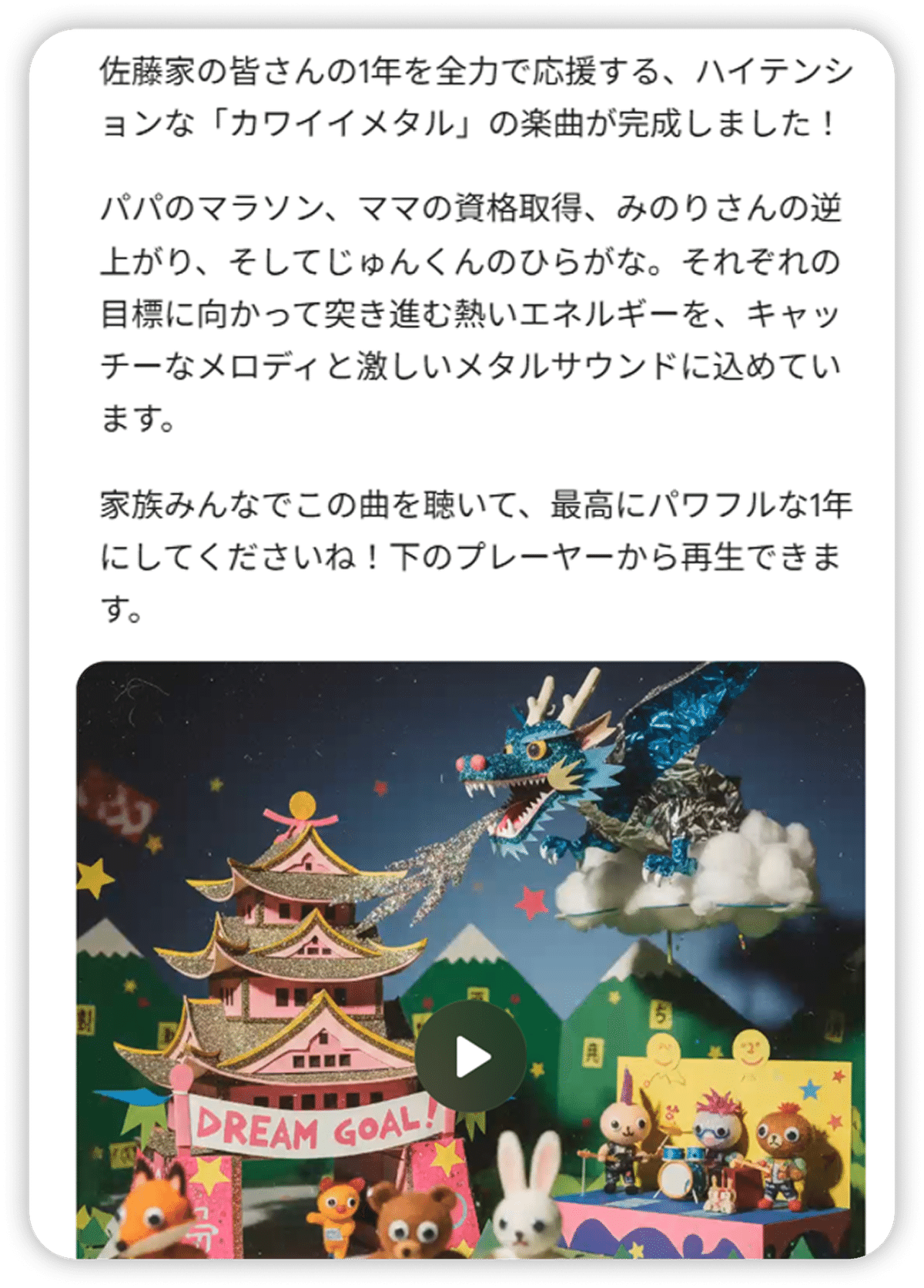 佐藤家の今年の目標をもとに、一年を応援してくれる歌を作ってください。