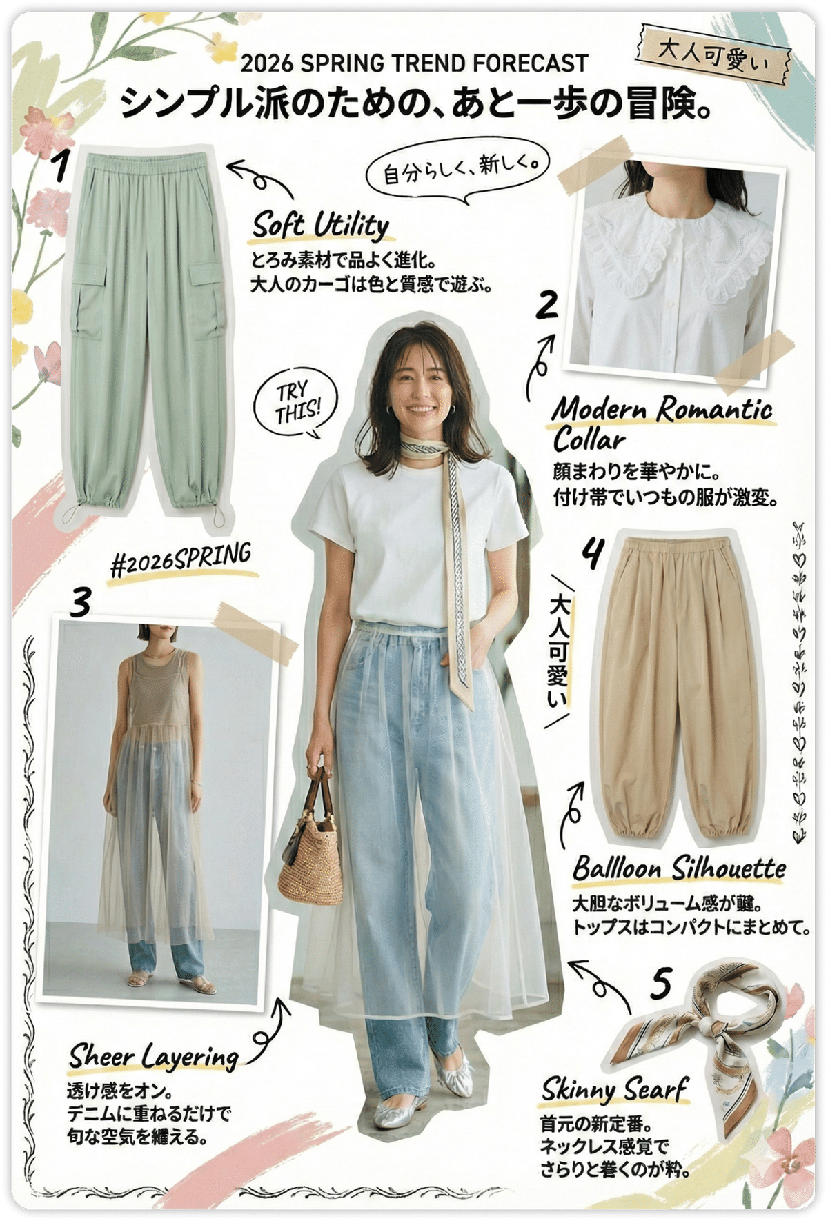 2026 年春のトレンドを雑誌みたいに画像で詳しく解説して。最新のランウェイや世界中の記事を調べて、シンプル好きの日本人女性が取り入れやすいものを 5 つ選んで。解説は日本語でお願い!
