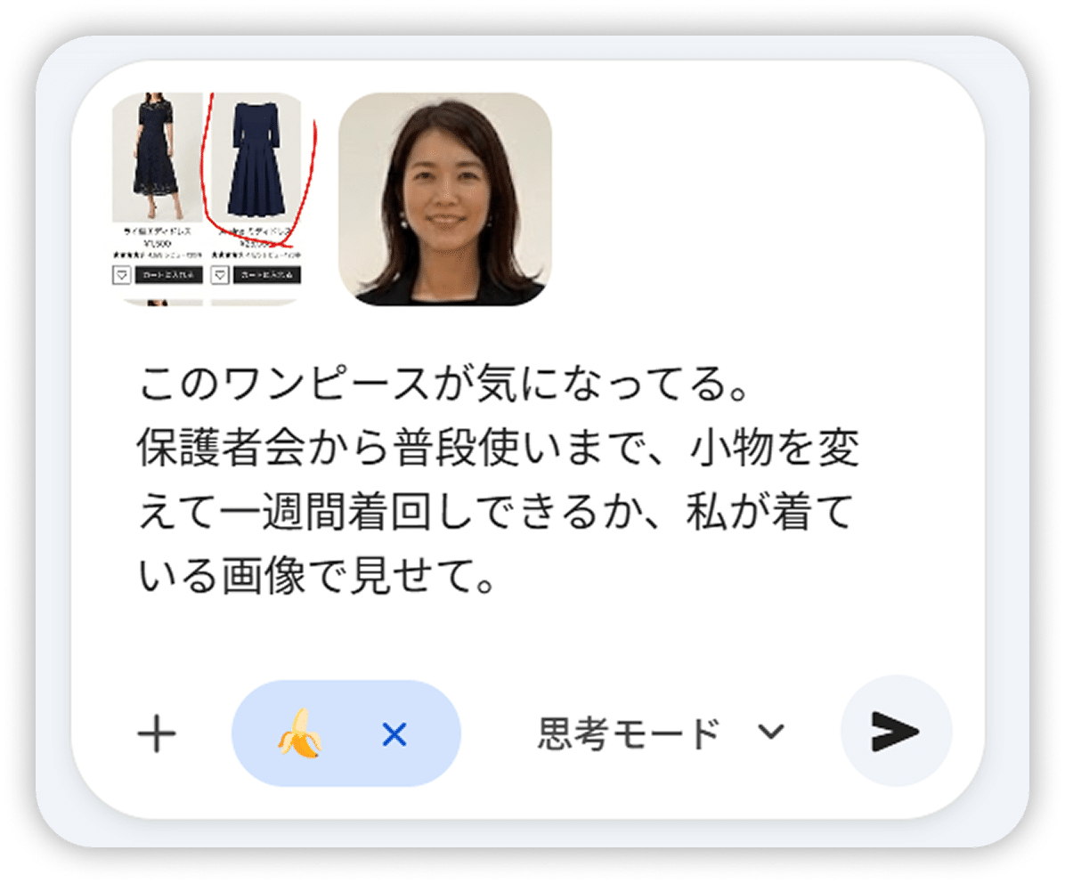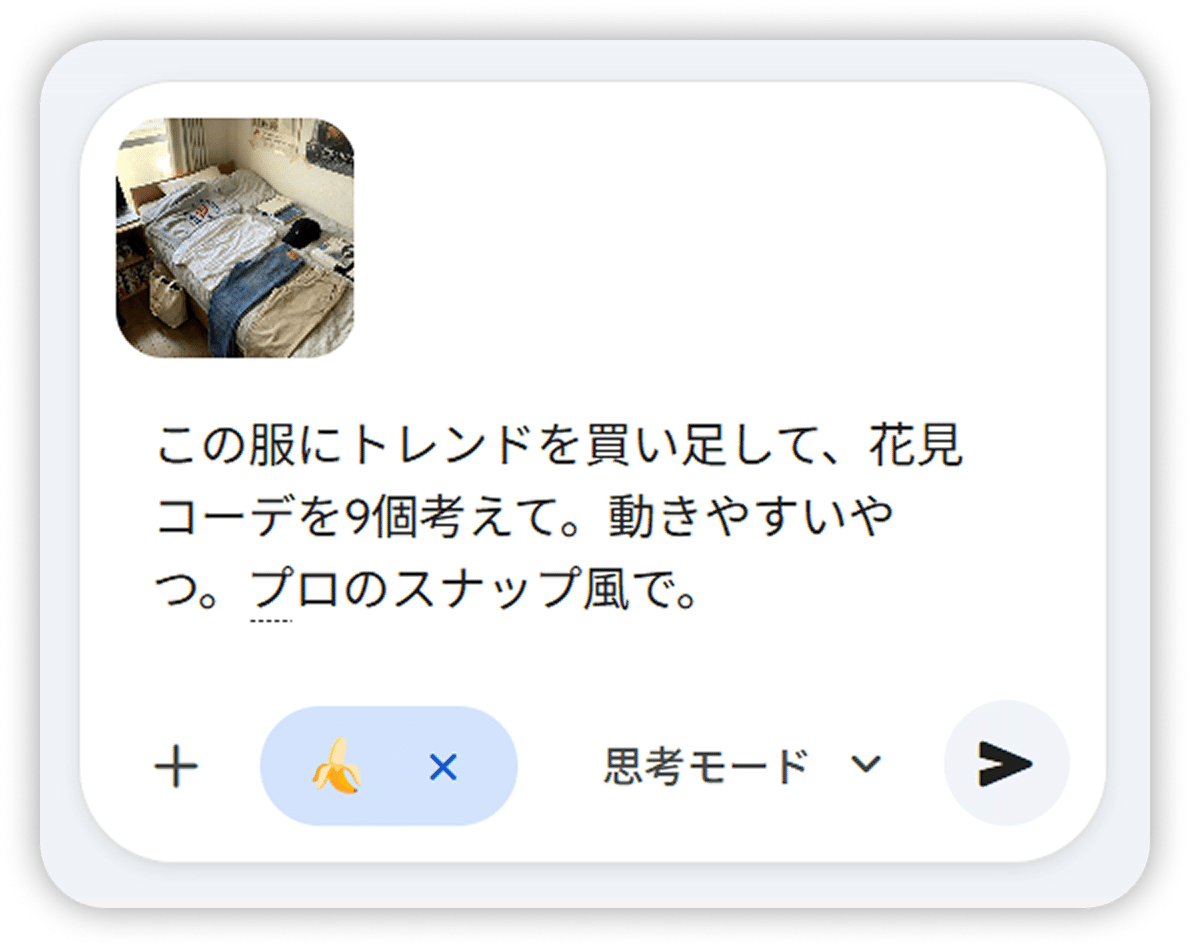 手持ちの服にトレンドアイテムを買い足したら、どんなコーデができるか Gemini に聞いてみてください。