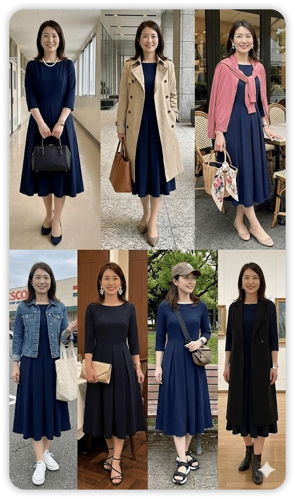 保護者会から普段使いまで、小物を変えて一週間着回しできるか、私が着ている画像で見せて。