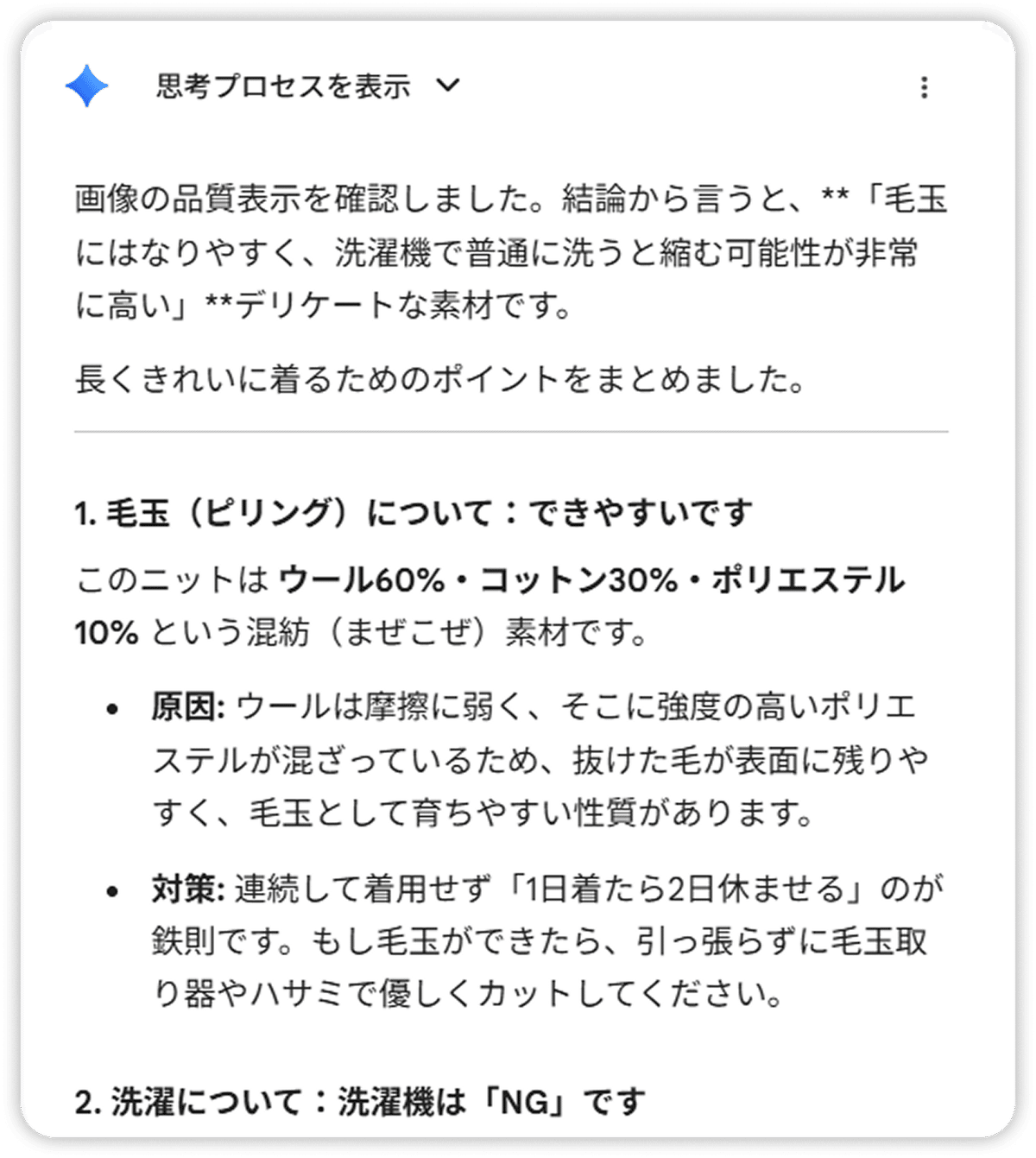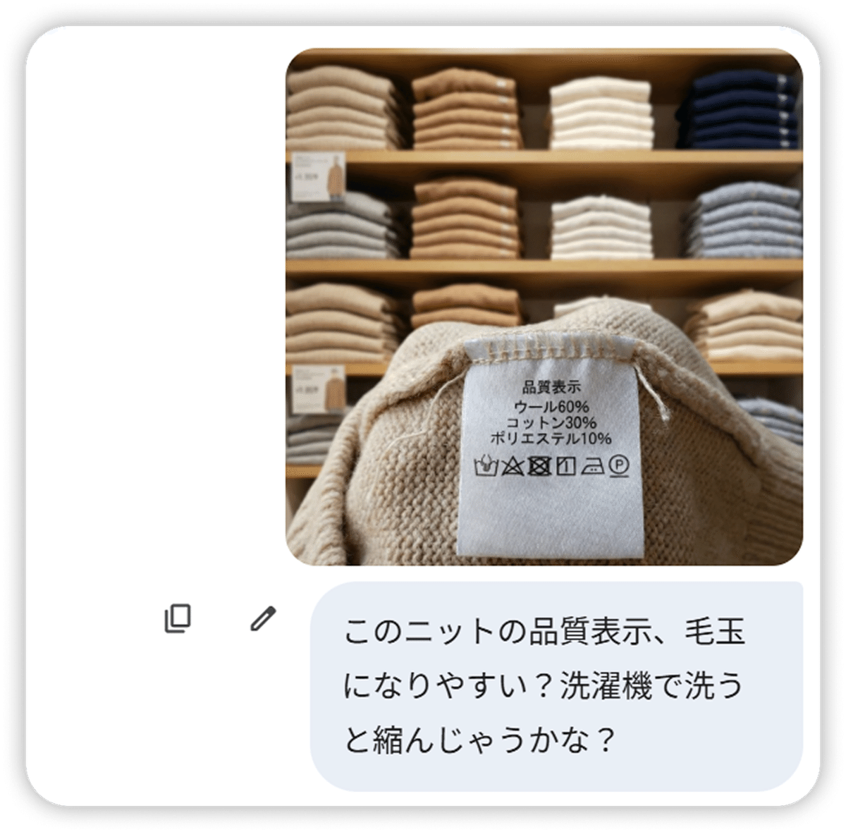 品質表示タグの写真を Gemini に送るだけで、毛玉のなりやすさや、かゆみ・縮みの心配まで一目でわかります。