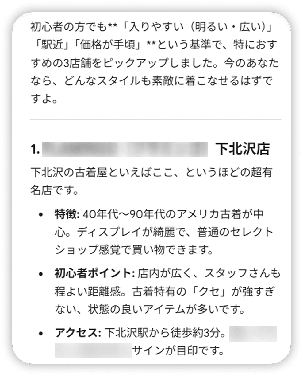 「どこで買う?」も、Gemini に相談すれば、自分の好みに合ったお店をすぐに見つけられます。 エリアや雰囲気、初心者でも入りやすいかどうかまで、細かい条件を伝えるほど、ぴったりの提案が返ってきますよ。