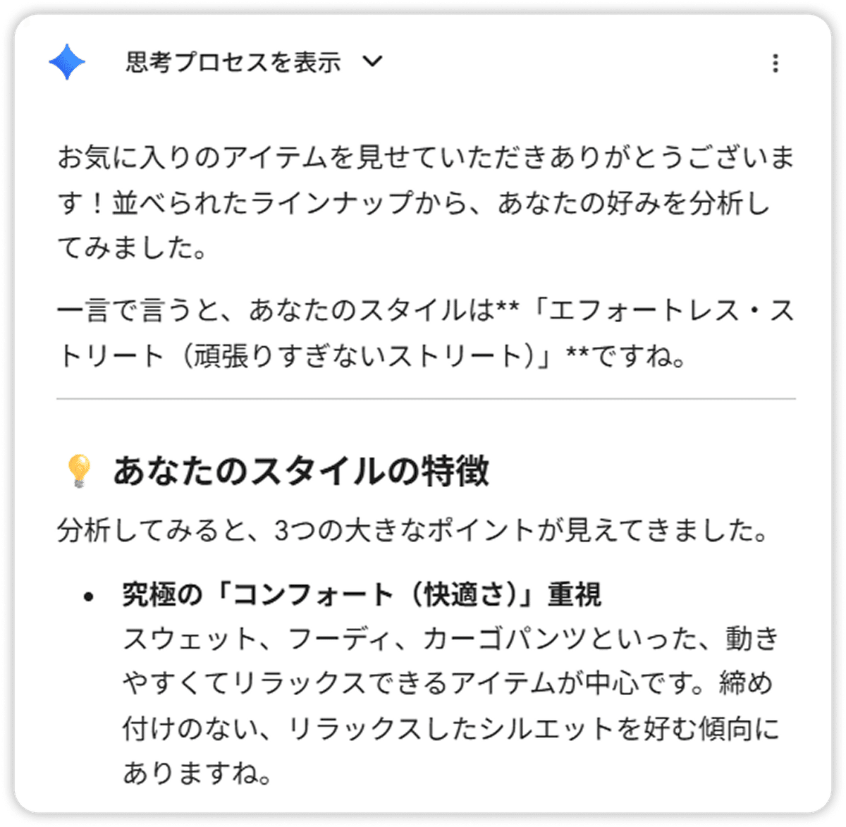 Gemini に「この服たち、どんなテイスト?」と聞くと、自分の好みの傾向が客観的に見えてきますよ。