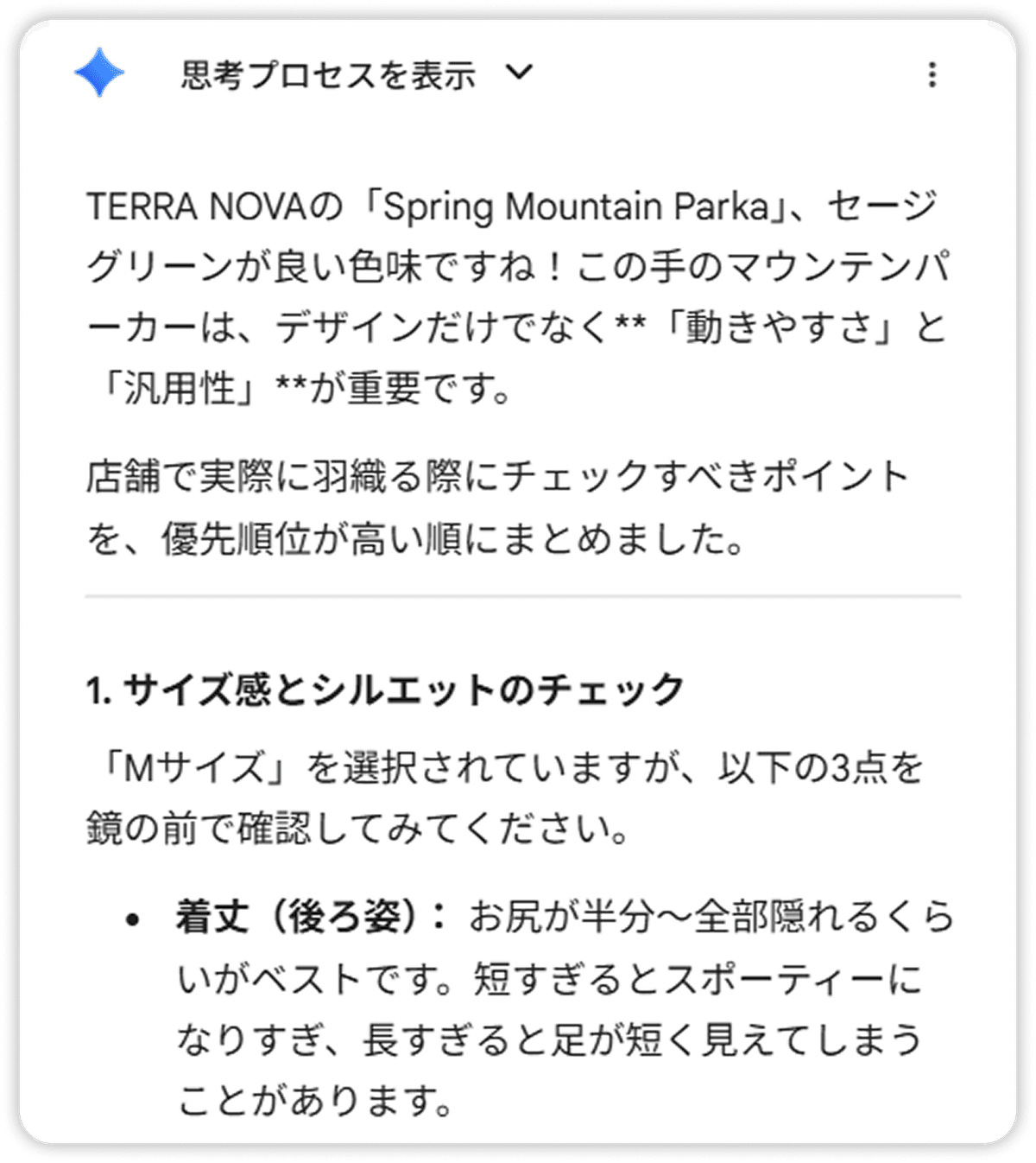 試着するときに「何を」確認したらいいかを、Gemini と一緒に押さえておきましょう。チェックポイントが分かっていると、試着がもっと楽しくなります。