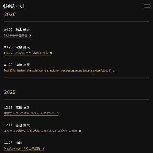 DeNAのAIに関する取り組みなどを掲載する公式サイト「DeNA×AI」内にまとめている。直近では、AIコーディング支援ツール「Claude Code」のログを解析する試みや、自然言語処理の学会「NLP2026」に参加して得た知見を紹介する資料などを公開している。