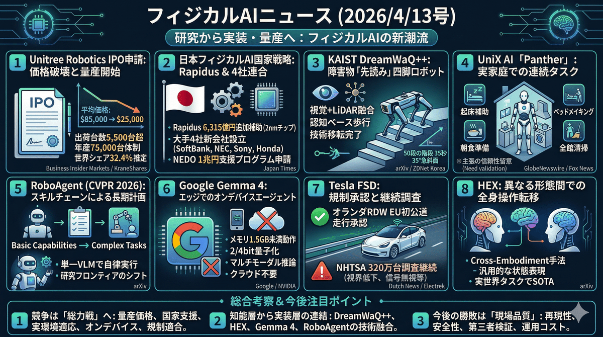 2026/4/12の特長は、フィジカルAIが研究段階から量産・実装・制度整備の局面へ一気に進み始めた点にある。UnitreeはIPO申請と大幅な価格低下、黒字化、量産投資でヒューマノイド市場の主導権を鮮明化し、日本はRapidus追加補助と大手4社連合で半導体から実装までの国産体制を急ぐ。KAISTのDreamWaQ++、RoboAgent、HEXは移動・計画・転移学習の技術進展を示し、Gemma 4はエッジ実装を現実化した。一方でUniX AIやTesla FSDは、実運用主張と独立検証・規制整合のギャップも浮き彫りにした。