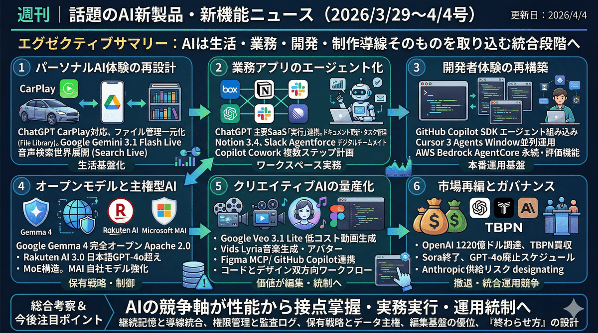 今週のAI新製品・新機能は、AIが単体機能の競争から、生活導線・業務導線・開発導線そのものを取り込む段階へ入ったことを示した。ChatGPTやGeminiは音声・車載・ファイル管理を通じて常時接続型の体験を強化し、Notion、Slack、Copilot、GitHub、Cursor、AWSは“参照するAI”から“実行するAI”へ進化した。さらにGemma 4やRakuten AI 3.0のようなオープンモデル拡大で主権型AIの現実味が増し、VeoやFigmaは制作工程の内製化を加速。市場は機能追加だけでなく、終了、移行、評価、供給リスクまで含めた統合運用競争に移っている。