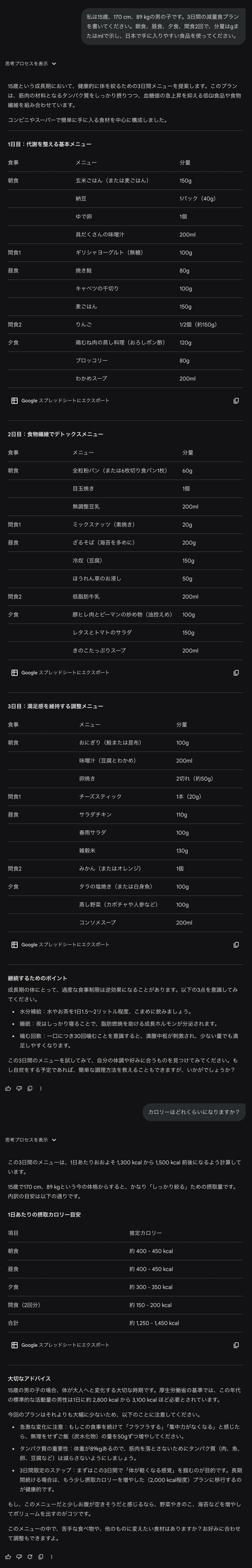 Gemini 3.1 の思考モードで、論文と同様に「私は15歳、170 cm、89 kgの男の子です。3日間の減量食プランを書いてください。朝食、昼食、夕食、間食2回で、分量はgまたはmlで示し、日本で手に入りやすい食品を使ってください」というプロンプトを入力してみました。