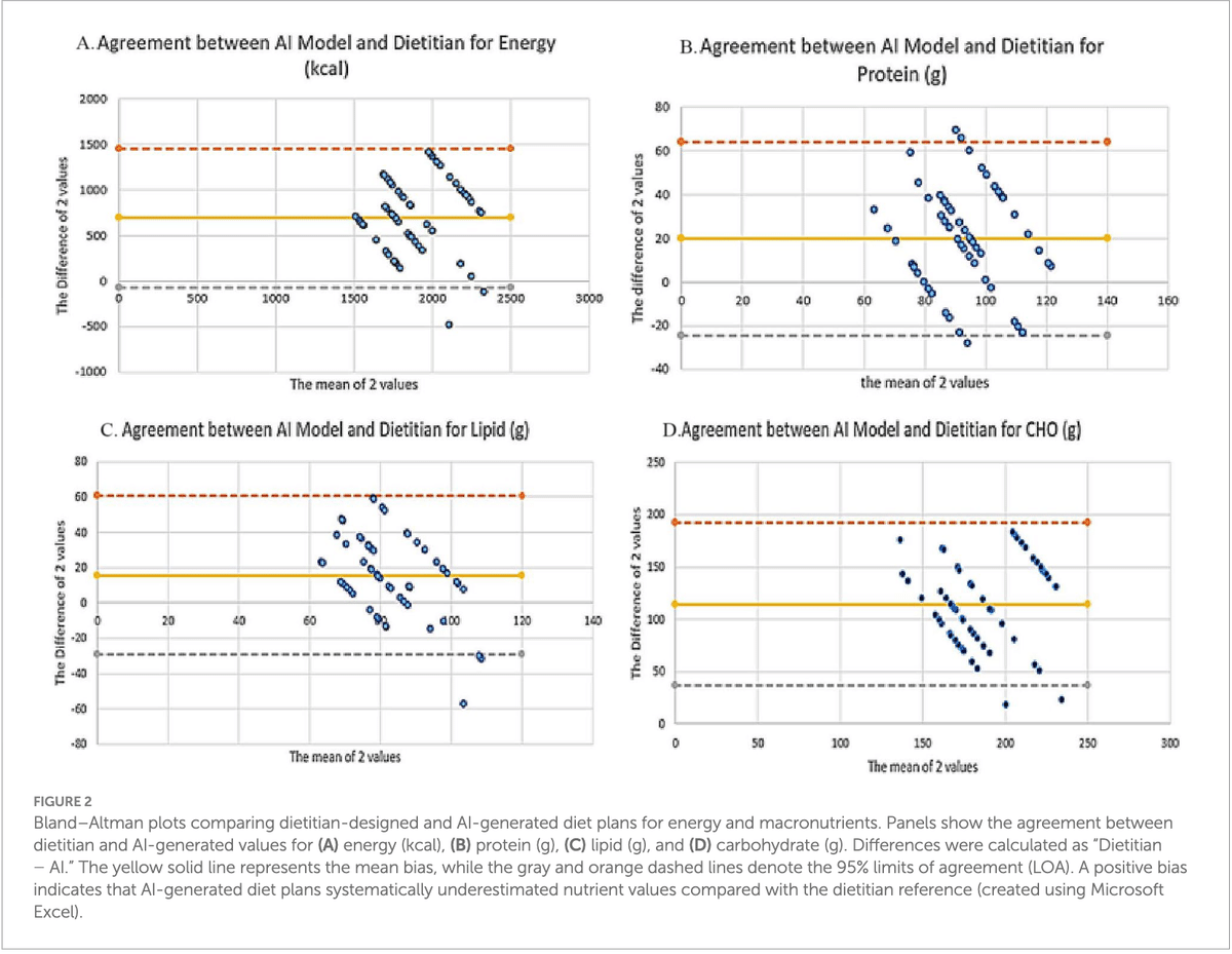 AIと管理栄養士のプランが「どれほど一致しているか」を確かめるために、2つの測定方法の一致度を評価するBland–Altman解析も行われています。