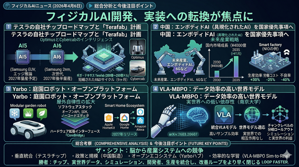 2026/4/5のフィジカルAIニュースは、知能モデル単体の競争から、半導体、国家投資、家庭向けプラットフォーム、学習基盤までを含む「実装力」の競争へ主戦場が移ったことを示している。テスラはAI5、AI6とTerafab構想で計算資源の内製化を進め、中国はEmbodied AIを国家成長戦略へ格上げし、Yarboは屋外ロボットをオープンプラットフォーム化、研究面ではVLA MBPOが実機依存を抑える学習法を提示した。フィジカルAIは、作る技術よりも、量産し学習し展開し続ける総合力が勝敗を決める段階に入りつつある。