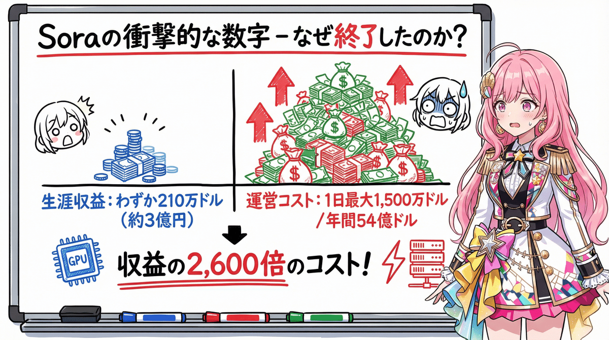 Redditのr/AI_Agentsでの分析によると、Soraの生涯収益210万ドルに対して、インフラ費用だけで年間54億ドル相当。