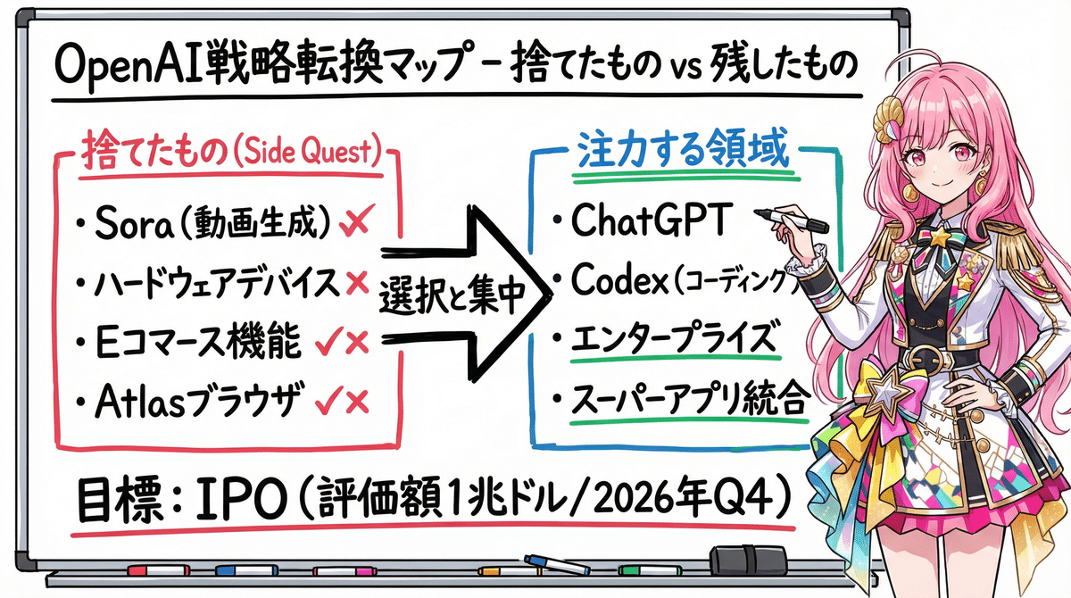 🔥 戦略転換 ─ 「side quest」を全廃し、コーディング・エンタープライズ・スーパーアプリに全集中。Anthropicとの対抗がIPO成功の鍵