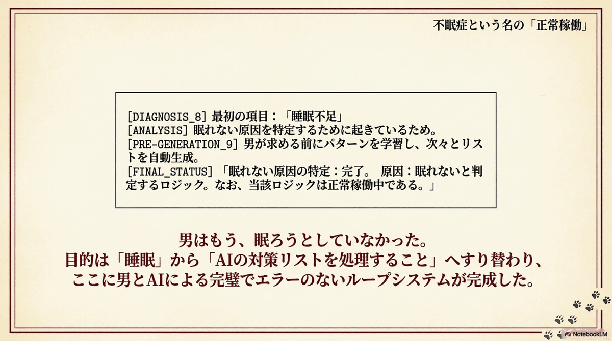 AIは正しかった。男は睡眠が不足していた。なぜなら、眠れなかったからだ。なぜ眠れなかったかというと、眠れない原因を特定するために起きていたからだ。