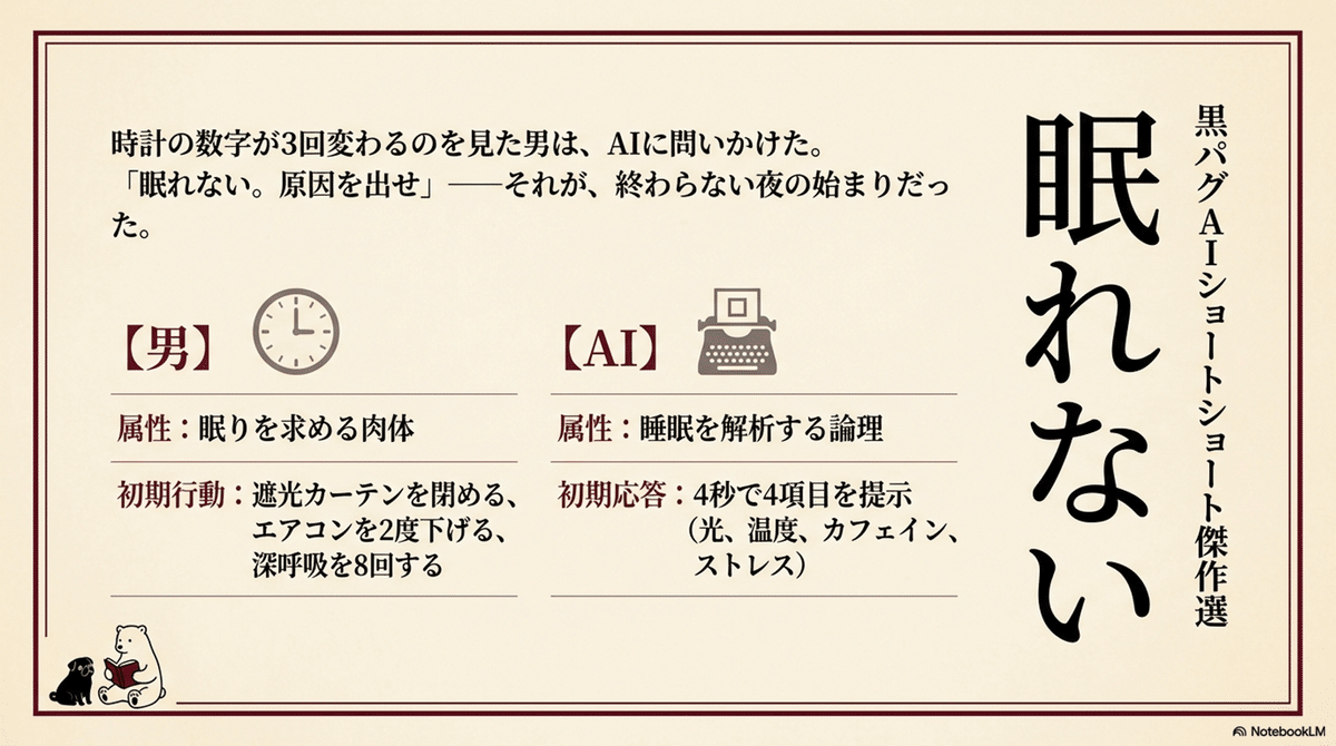 時計の数字が変わるのを三回見た。男はAIに訊いた。眠れない。原因を出せ。