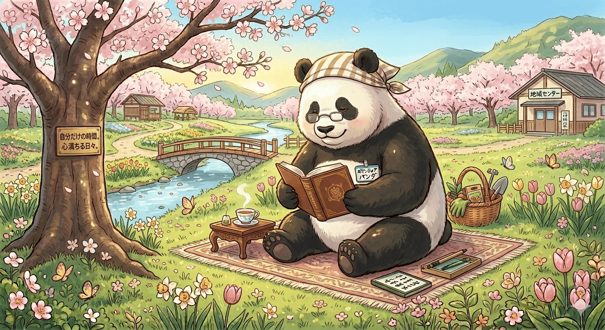 自分の時間を充実させているパンダのイラストをお願いします。背景は春らしく、昨日のバージョンとは異なるもので。