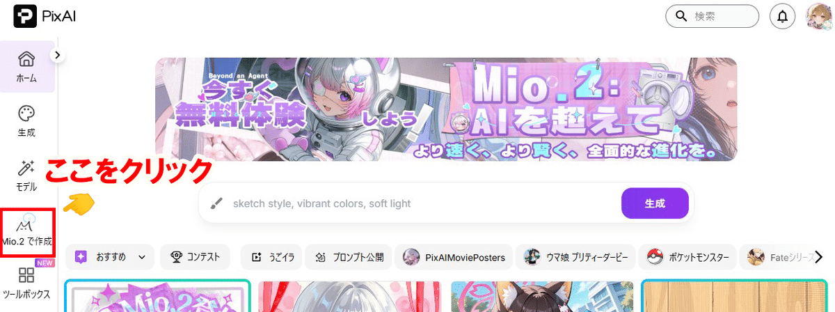 ここからは、PixAIがどういったサービスなのか紹介しつつ「Mio.2」を活用したAI漫画生成について解説していきますね😊