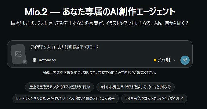 PixAIでは、新機能としてAIと対話しながらイラストや漫画制作の手助けをして入れる「Mio.2」が実装されています。