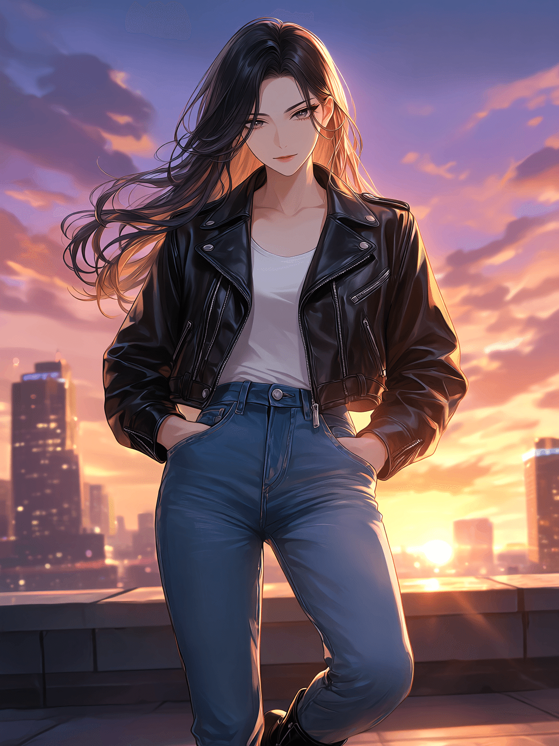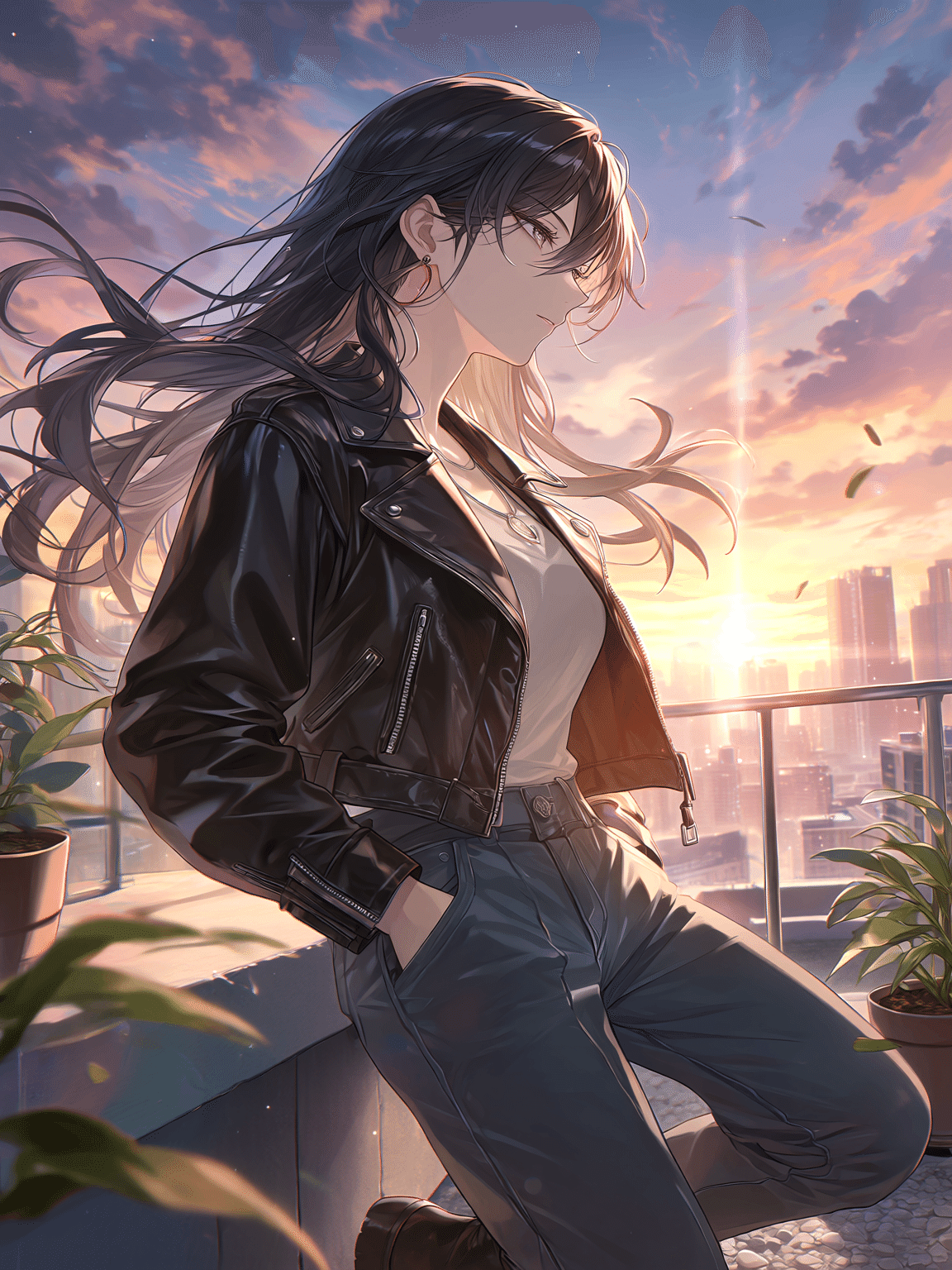 オレンジと紫が混ざる空と、都会のシルエットを背景に、風に髪をなびかせながら遠くを見つめる雰囲気を出してみました。