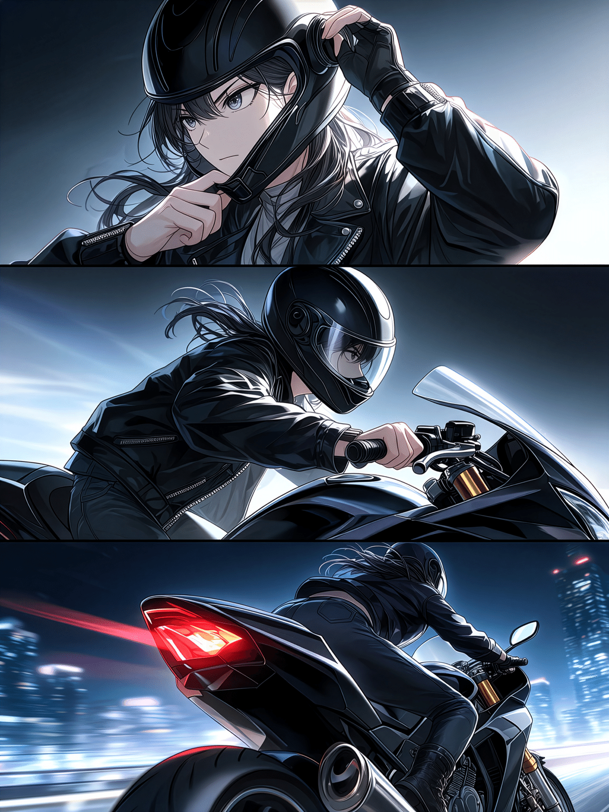 3コマ目:ヘルメットをかぶったまま、光の軌跡を残しながら夜の街へ走り去る。