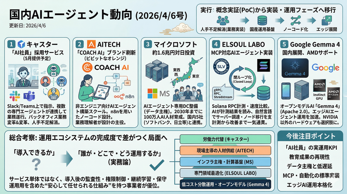 2026/4/5に見て取れる特長は、日本のAIエージェント活用が「導入できるか」ではなく「誰が・どこで・どう運用するか」という実務論へ移った点にある。キャスターは労働力代替としてのAI、AITECHは現場主導の設計人材育成、マイクロソフトはデータ主権を踏まえた計算基盤整備、ELSOUL LABOは特定業界での閉ループ運用、Gemma 4はオープンモデルと非NVIDIA環境の拡大を示した。つまり市場全体は、業務実装、人材供給、インフラ主権、専門領域最適化、低コスト分散運用という5層で同時に立ち上がっており、日本のAIエージェント競争はサービス単体ではなく「運用エコシステム」の完成度で差がつく局面に入ったといえる。