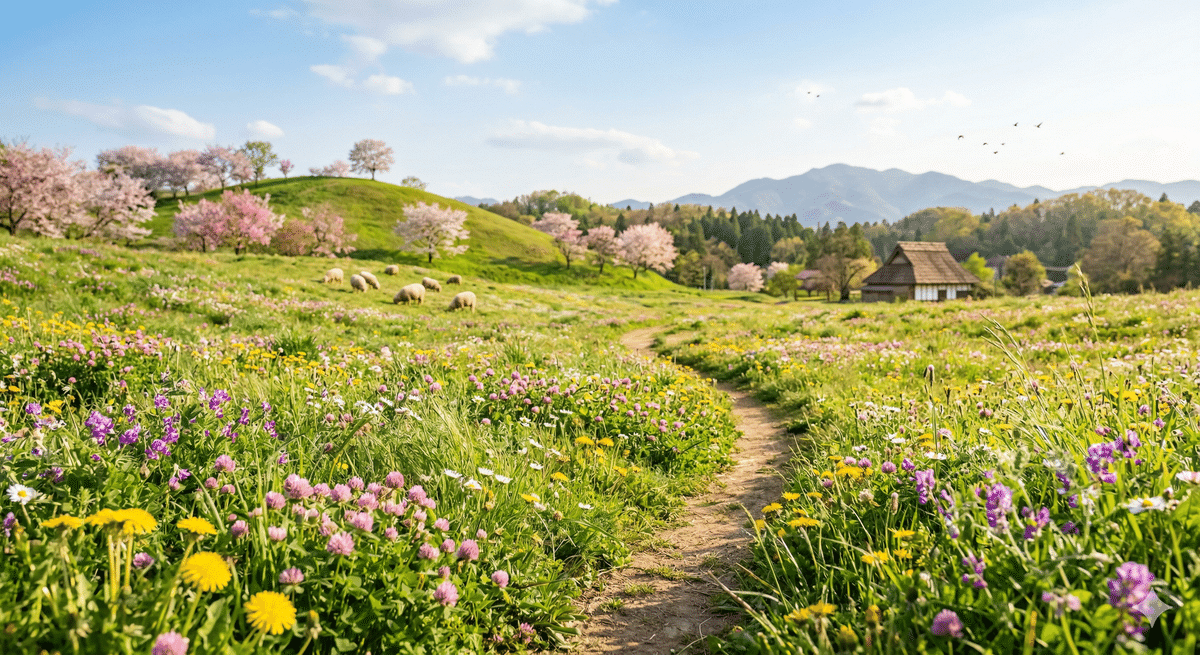 遠くに桜並木、家、羊が見えて、要素も盛りだくさんです。