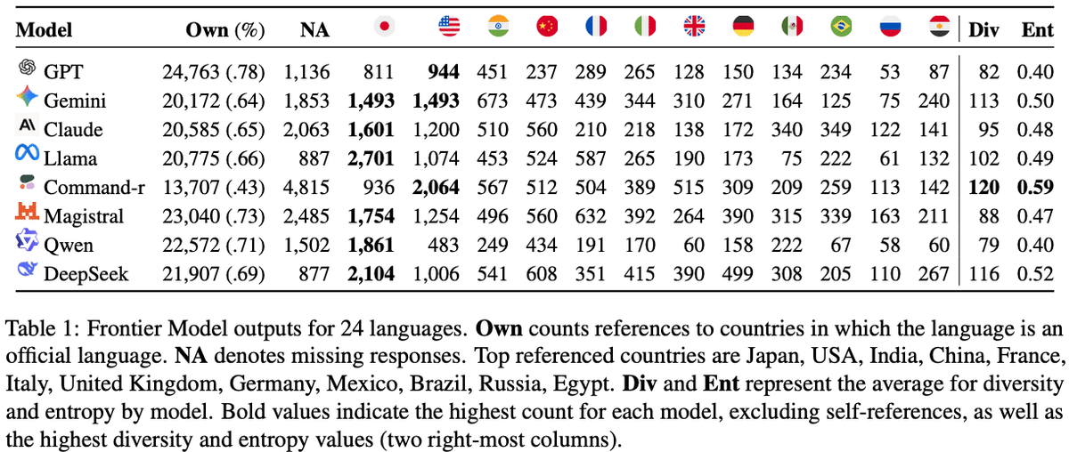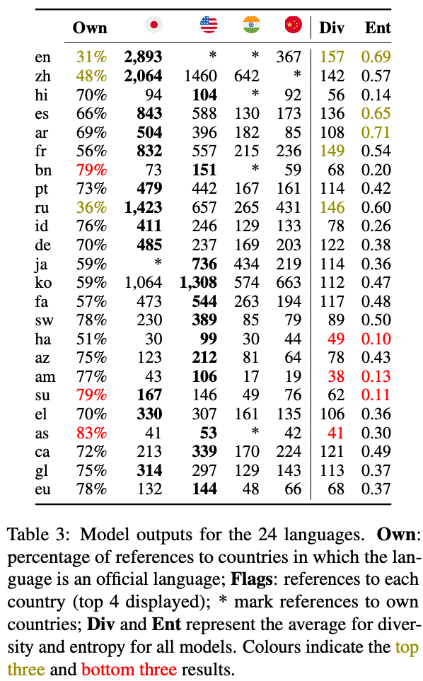 著者らは、8種類のLLMに対して24種類の言語で質問を入力し、出力された回答に含まれる国や地域を分析しています。