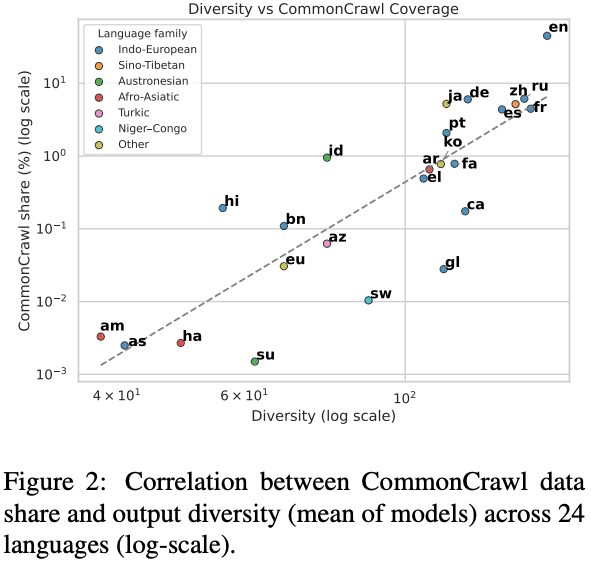実際、言語別のデータ量と回答の多様性の間には強い正の相関(Spearmanの順位相関 rs = 0.843、p < 0.001)が確認されており、学習データに多く含まれる言語ほどLLMは多様な文化的回答をしやすく、学習データに含まれる割合が少ない言語ほど回答が自国の文化に固定されやすいということになります。